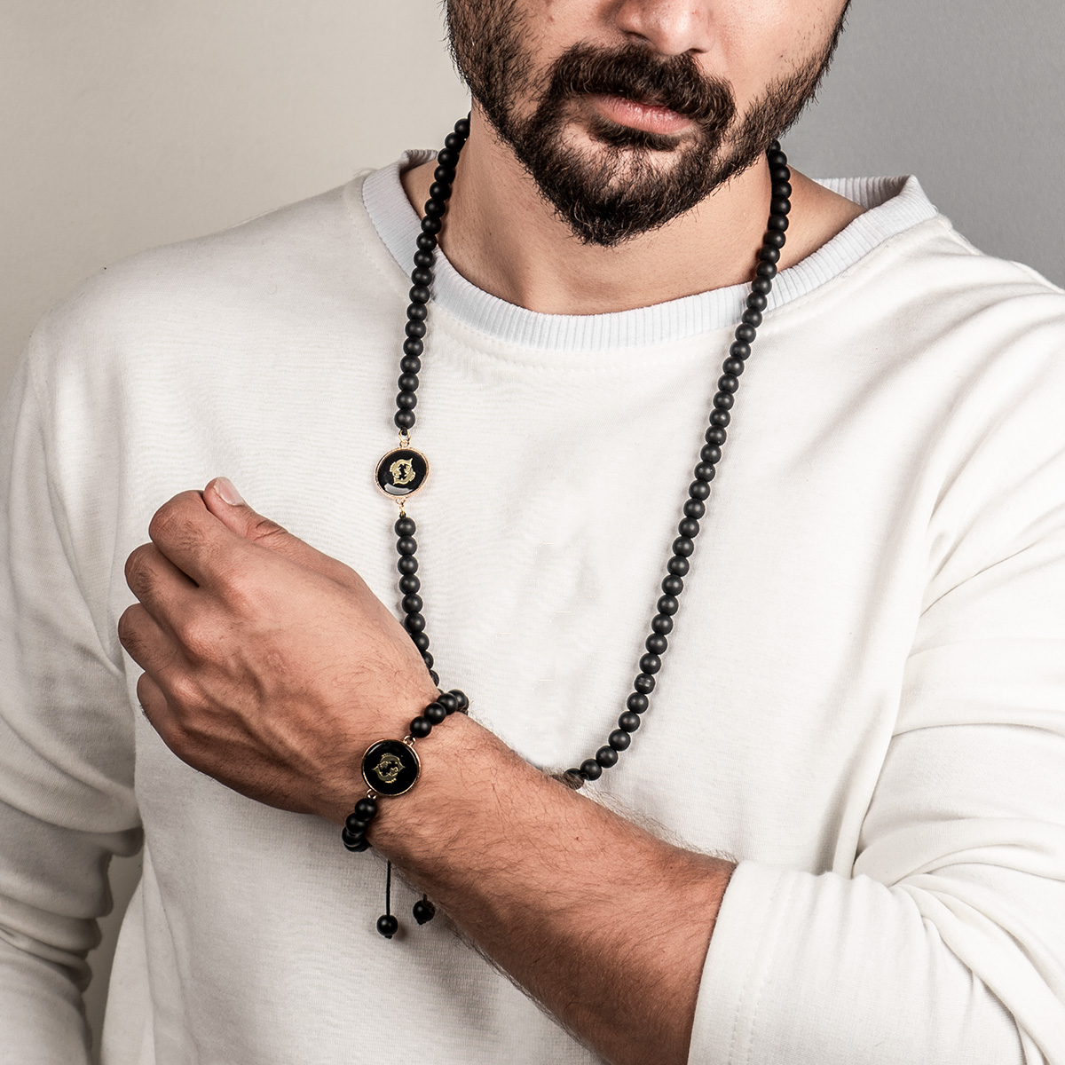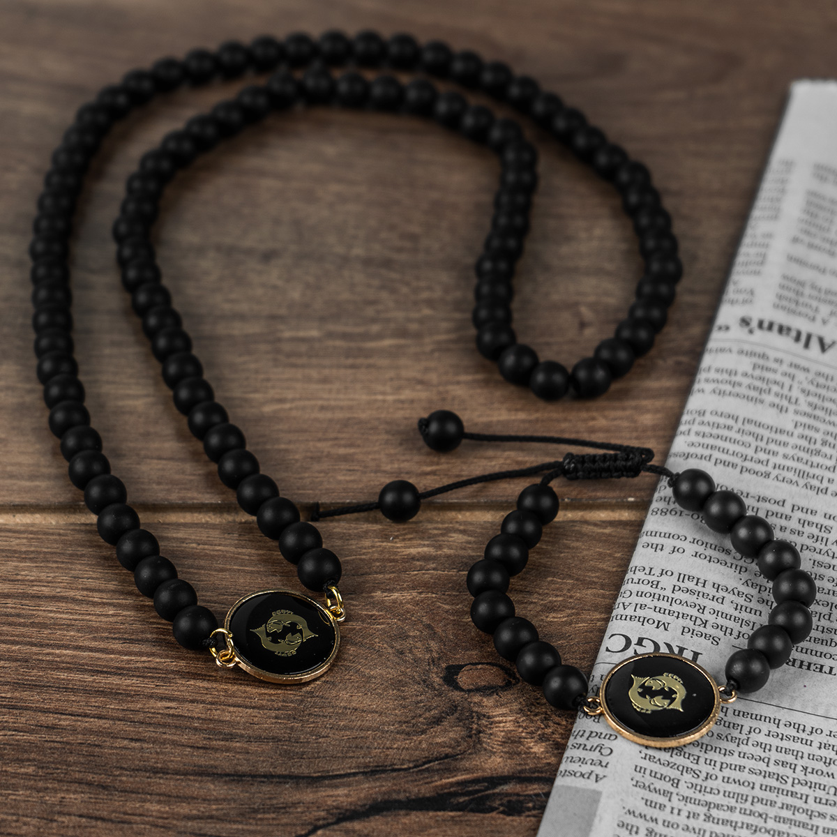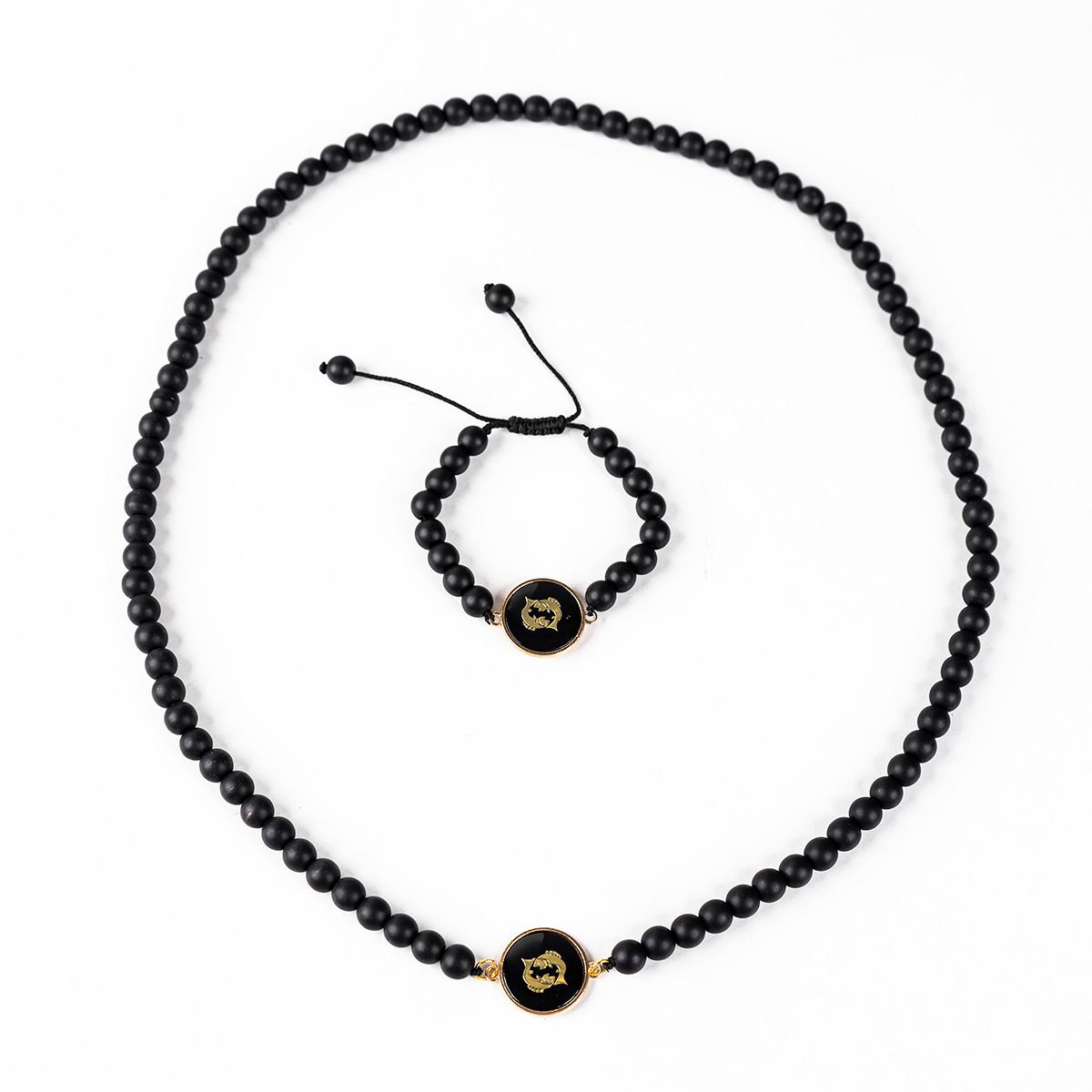 نیم ست های مهره ای مشکی از انواع گردنبندهای رو لباسی است که محبوبیت خاصی بین جوانان پیدا کرده است و جذابیت زیادی به استایل شما میدهد.طرح روی پلاک این گردنبندها نماد ماه های سال بوده و میتوانید ماه مورد نظرتان را انتخاب نمایید. قطر سنگ ها 2 میلی متر و به رنگ مشکی مات بوده و به دلیل طراحی خاص، برای استفاده روزانه و قابل ست شدن با انواع پوشش ها و مناسب برای آقایان و خانم هاست.