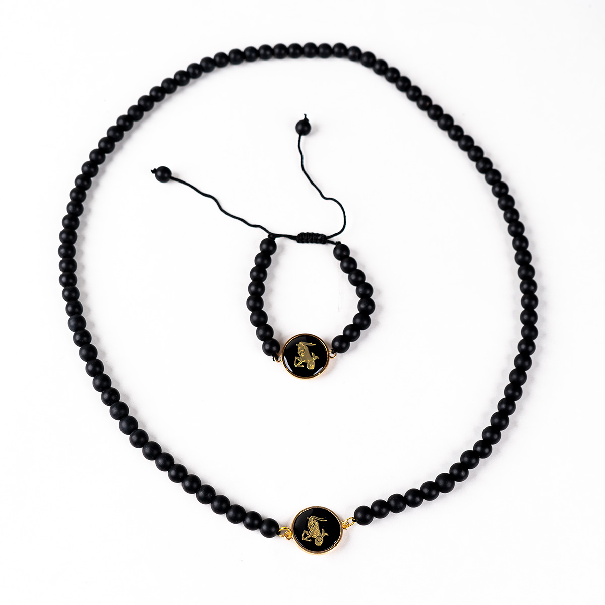 نیم ست های مهره ای مشکی از انواع گردنبندهای رو لباسی است که محبوبیت خاصی بین جوانان پیدا کرده است و جذابیت زیادی به استایل شما میدهد.طرح روی پلاک این گردنبندها نماد ماه های سال بوده و میتوانید ماه مورد نظرتان را انتخاب نمایید. قطر سنگ ها 2 میلی متر و به رنگ مشکی مات بوده و به دلیل طراحی خاص، برای استفاده روزانه و قابل ست شدن با انواع پوشش ها و مناسب برای آقایان و خانم هاست.