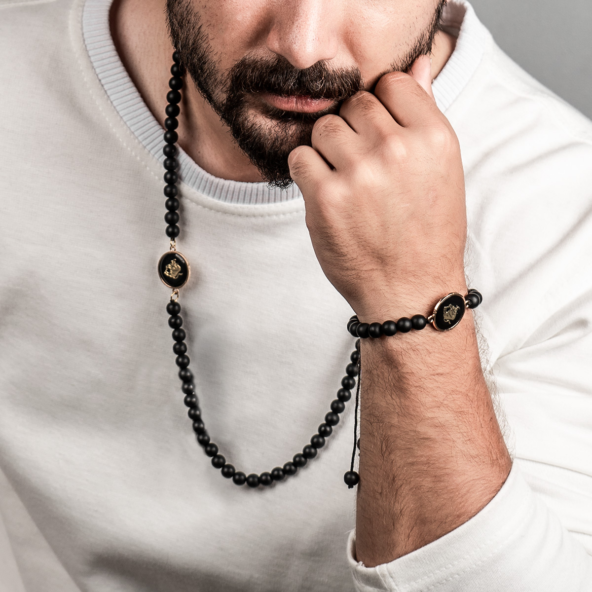 نیم ست های مهره ای مشکی از انواع گردنبندهای رو لباسی است که محبوبیت خاصی بین جوانان پیدا کرده است و جذابیت زیادی به استایل شما میدهد.طرح روی پلاک این گردنبندها نماد ماه های سال بوده و میتوانید ماه مورد نظرتان را انتخاب نمایید. قطر سنگ ها 2 میلی متر و به رنگ مشکی مات بوده و به دلیل طراحی خاص، برای استفاده روزانه و قابل ست شدن با انواع پوشش ها و مناسب برای آقایان و خانم هاست.