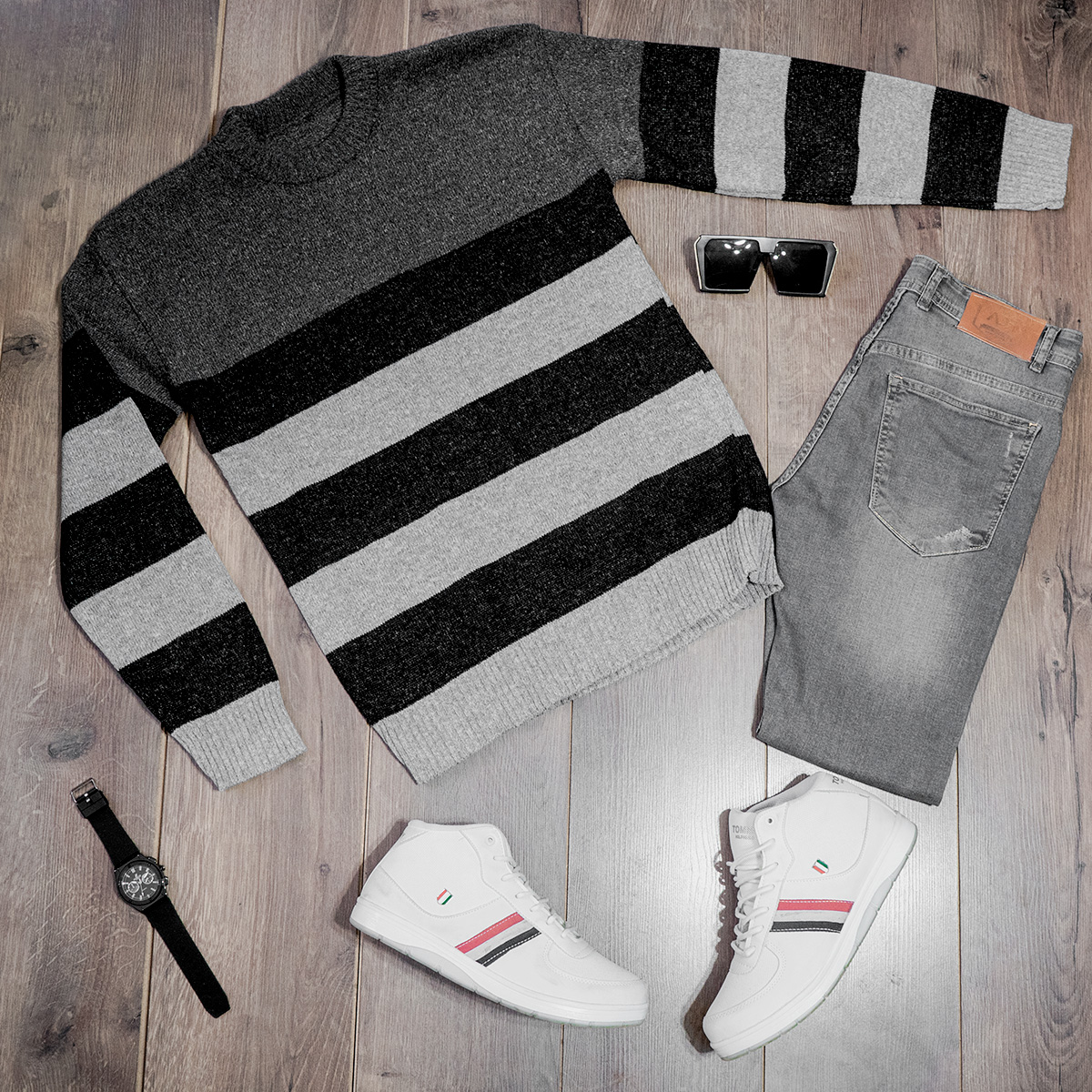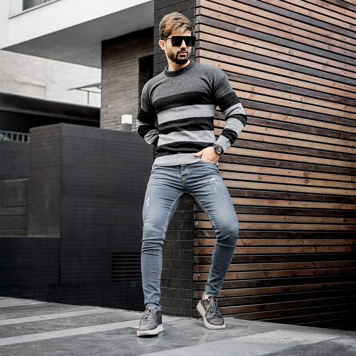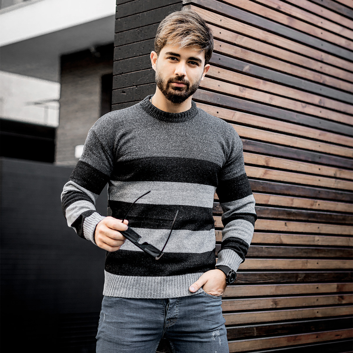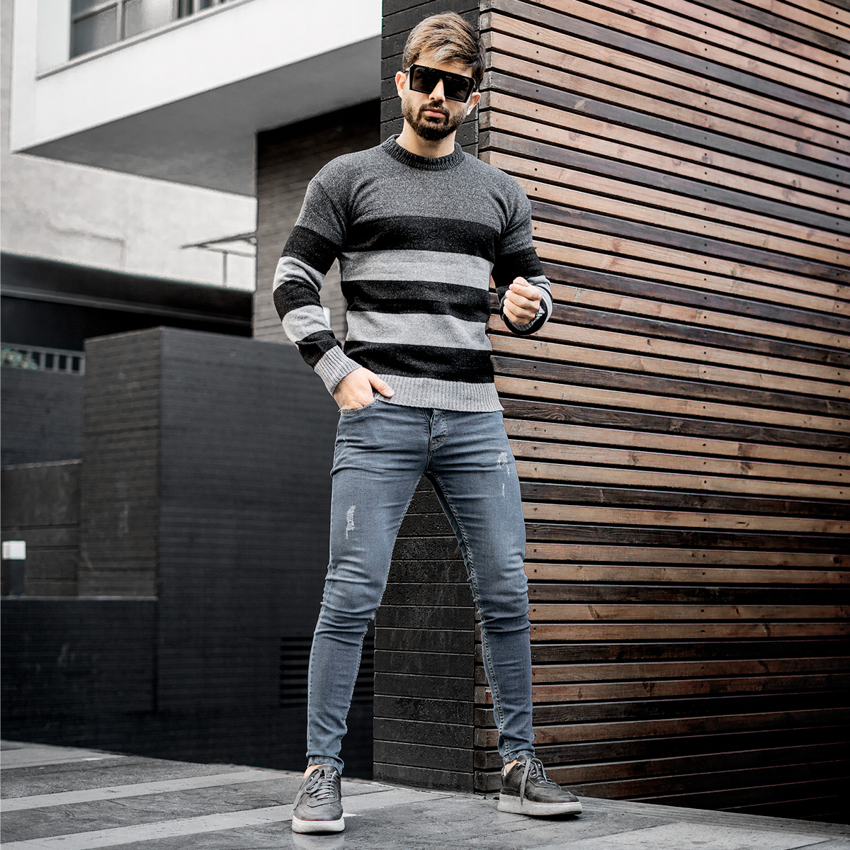پلیور راه راه طوسی ذغالی مردانه مدل Sosha
