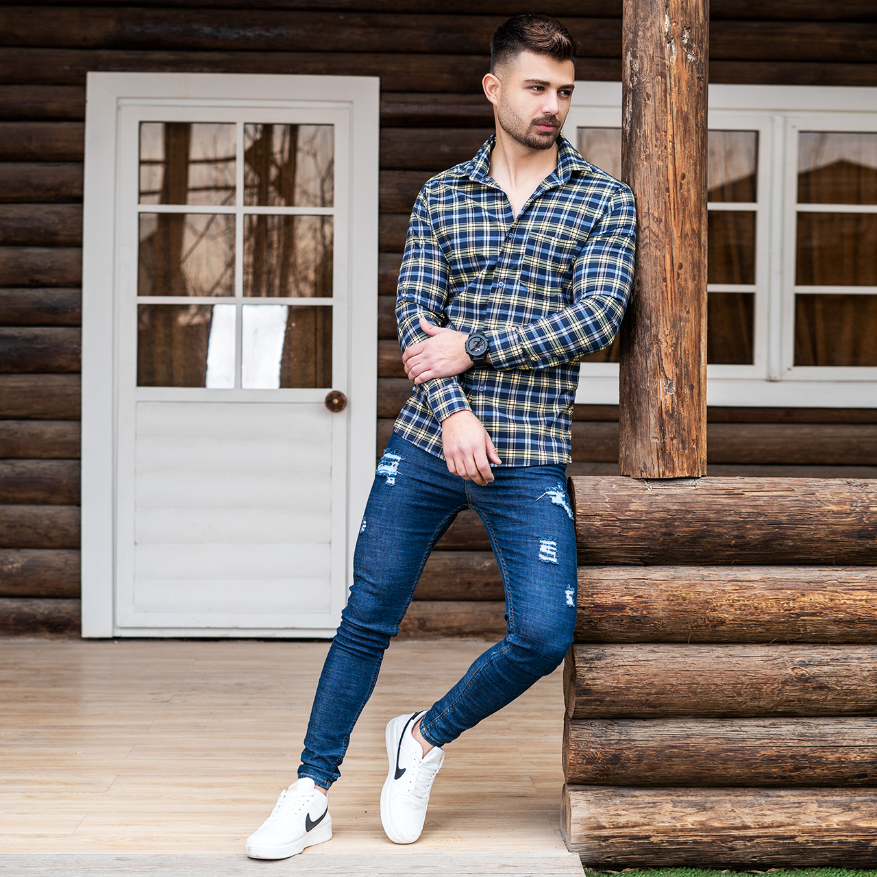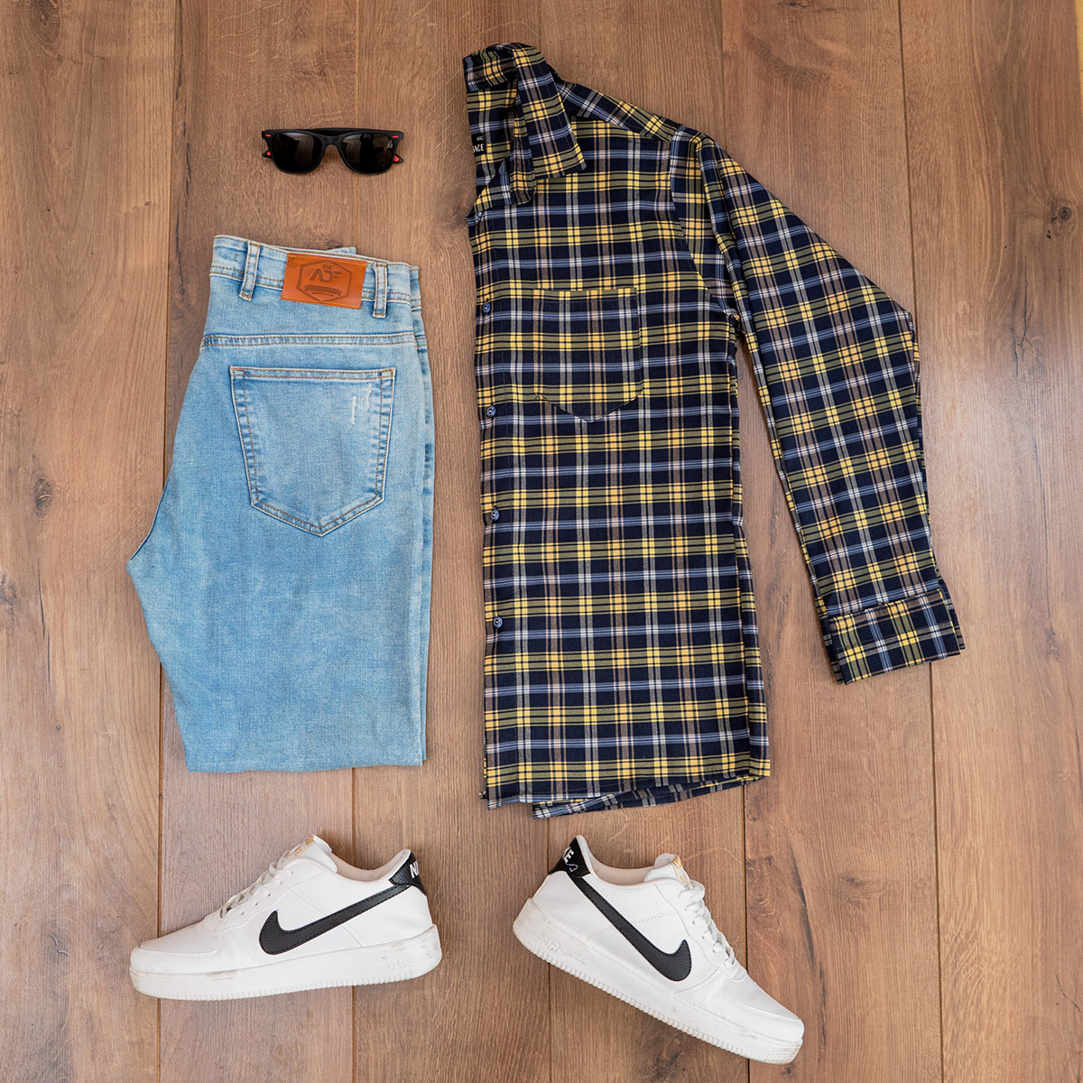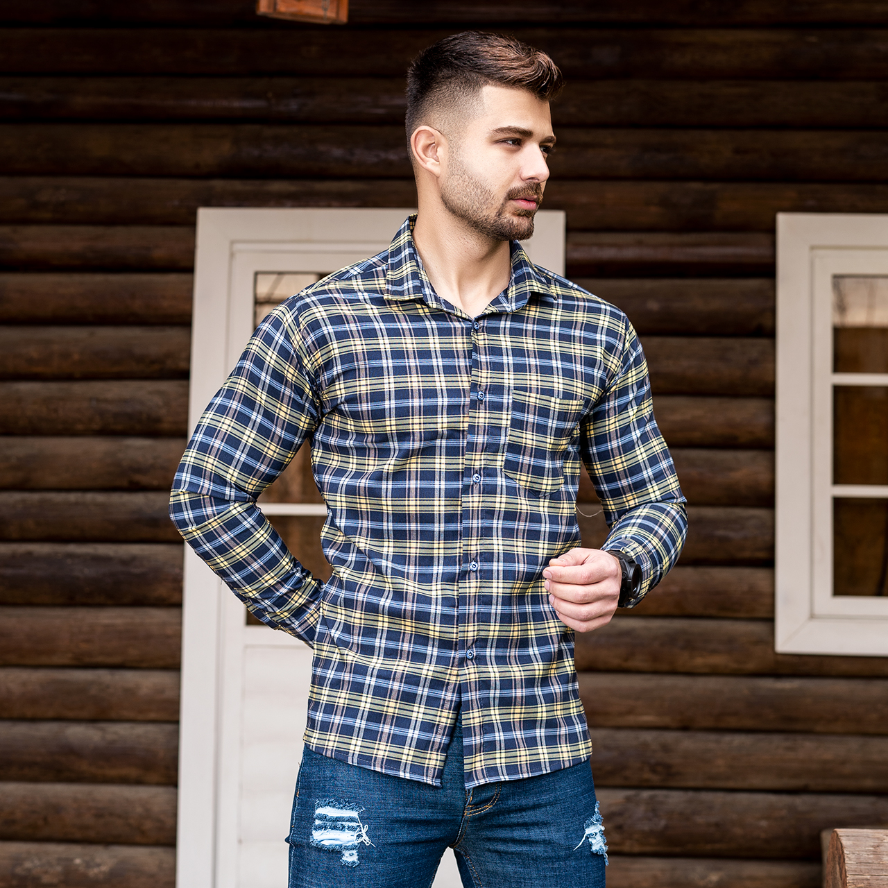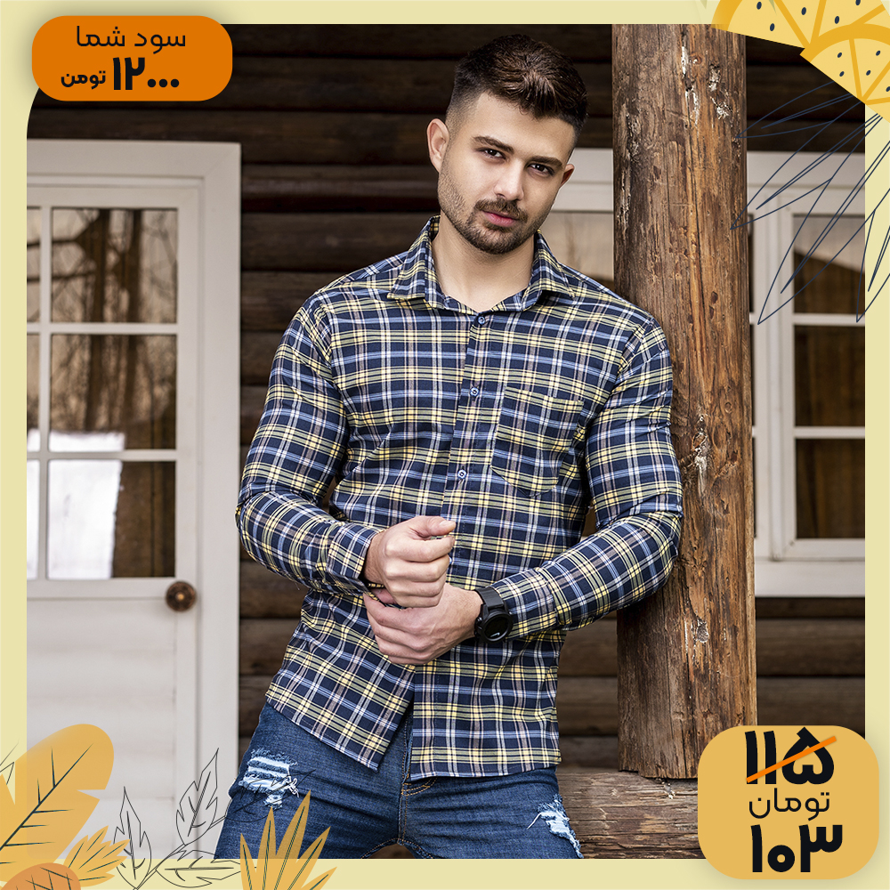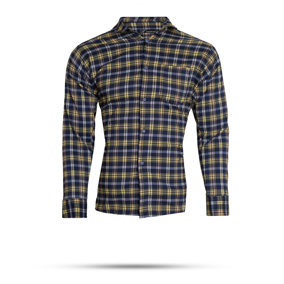 پیراهن چهارخانه زرد سرمه ای مردانه مدلDivan