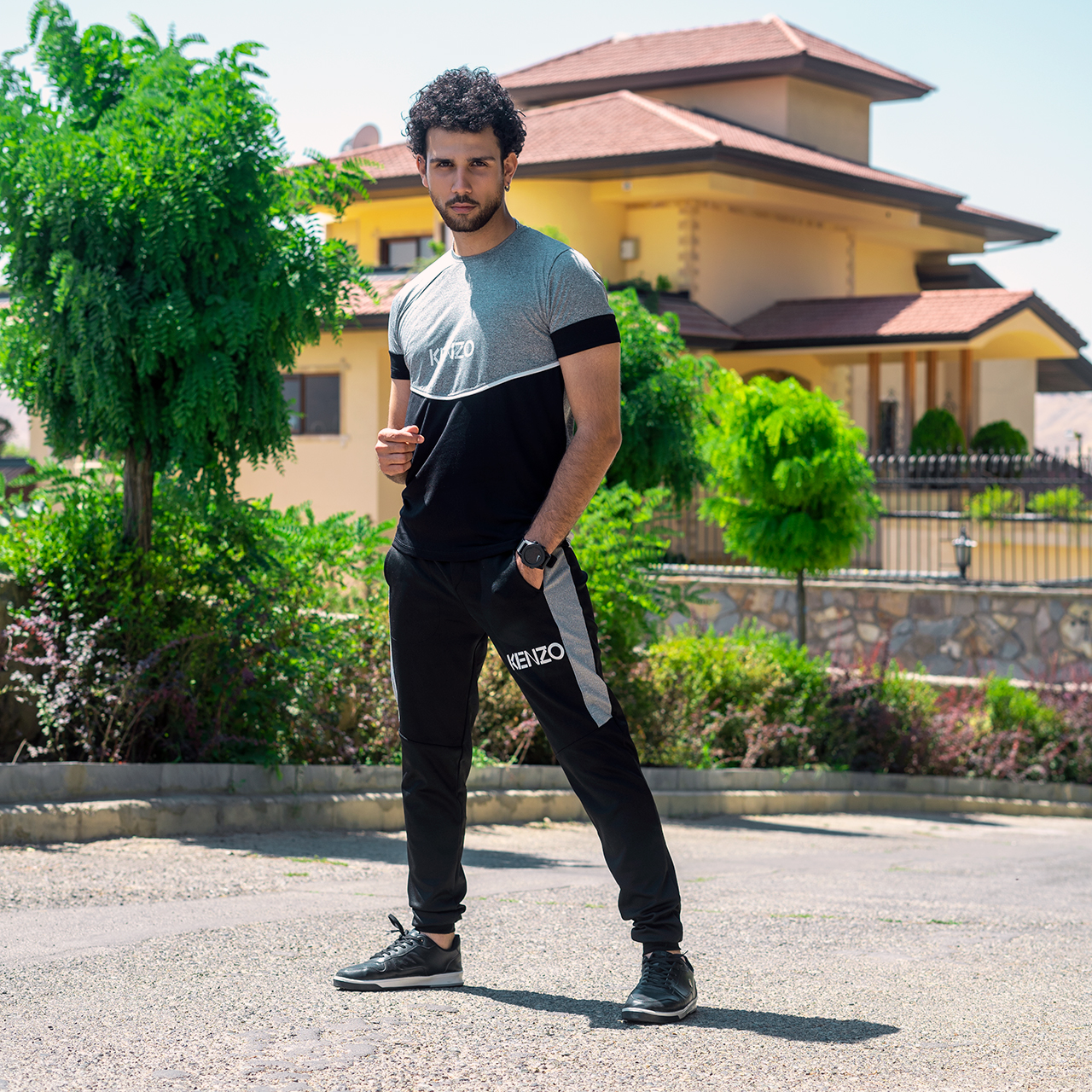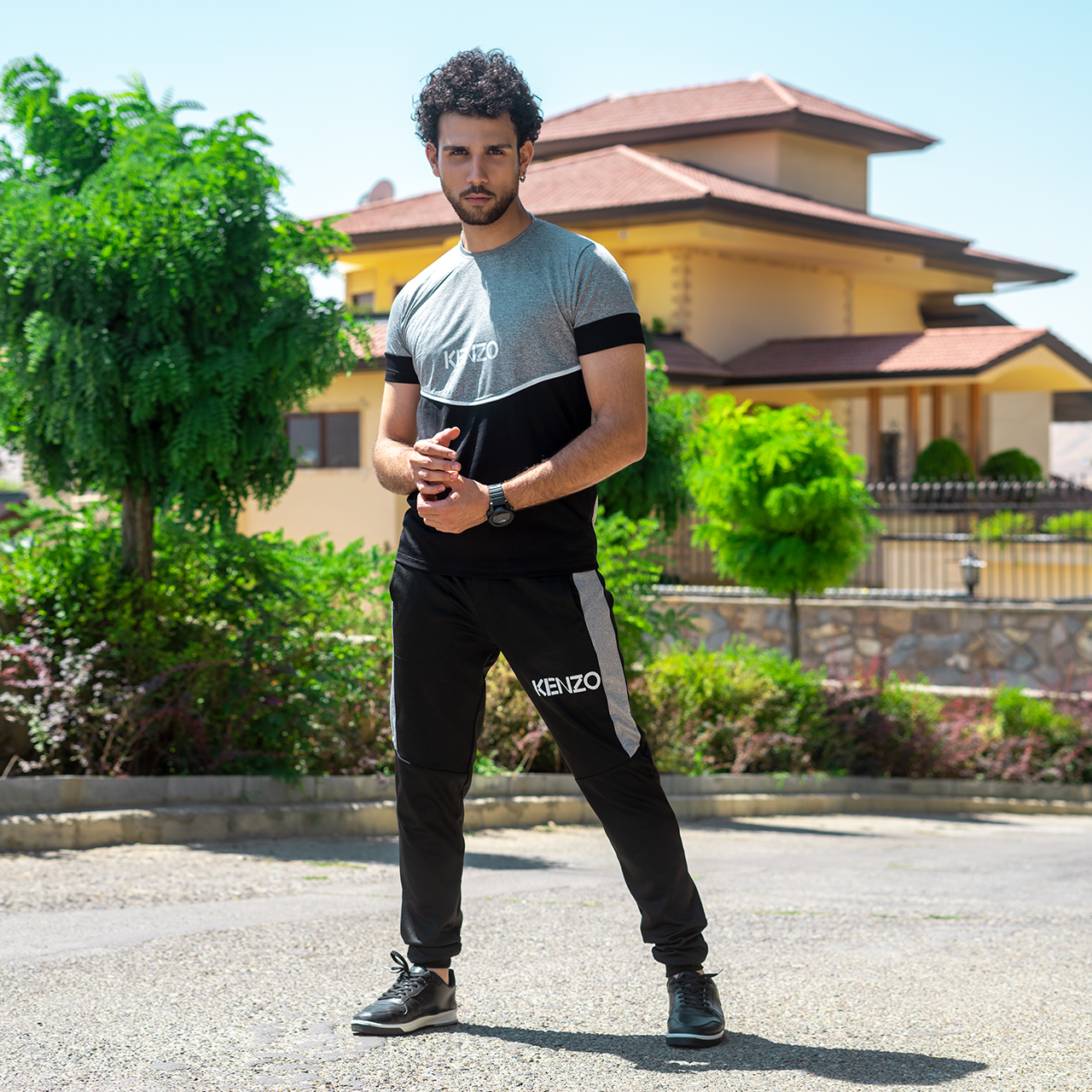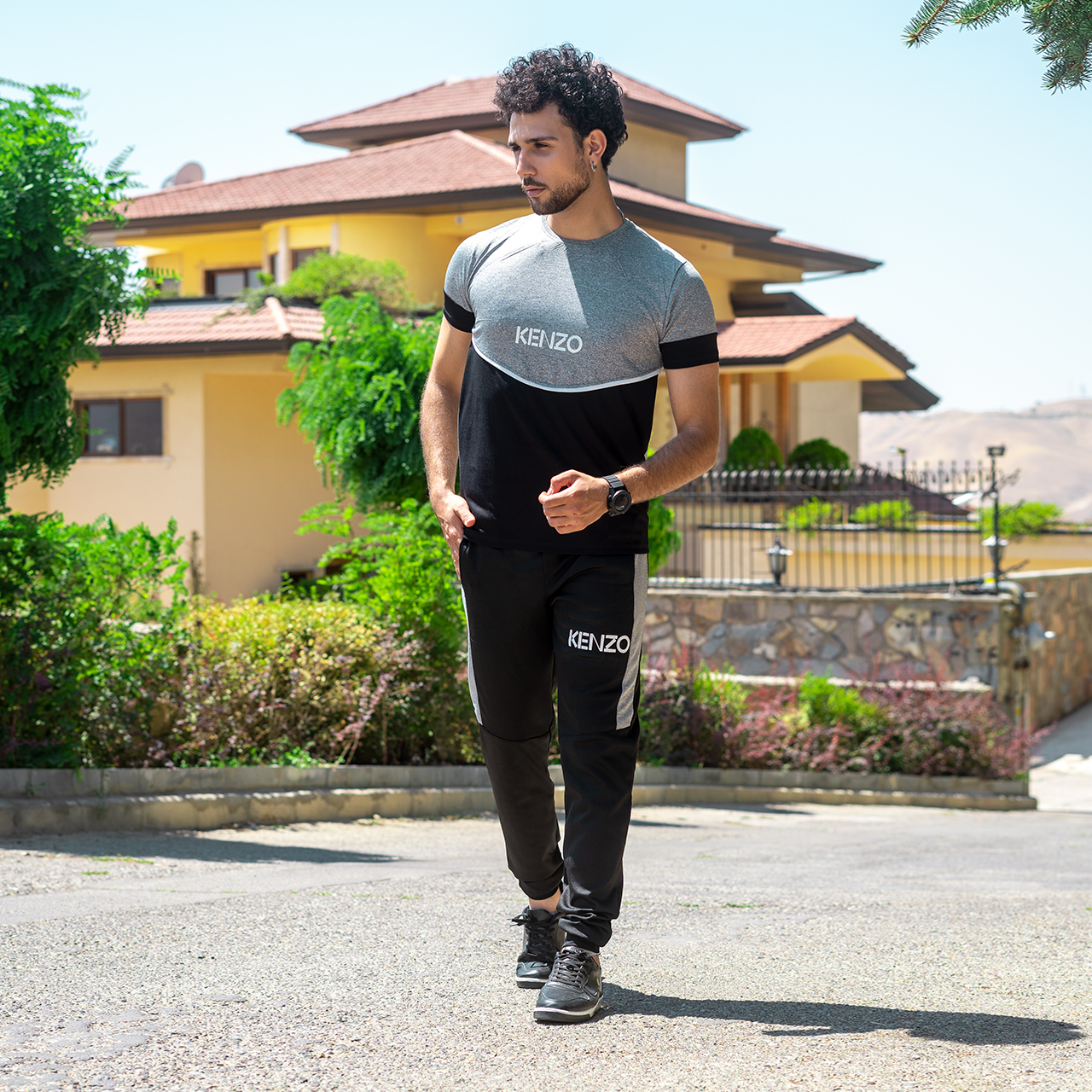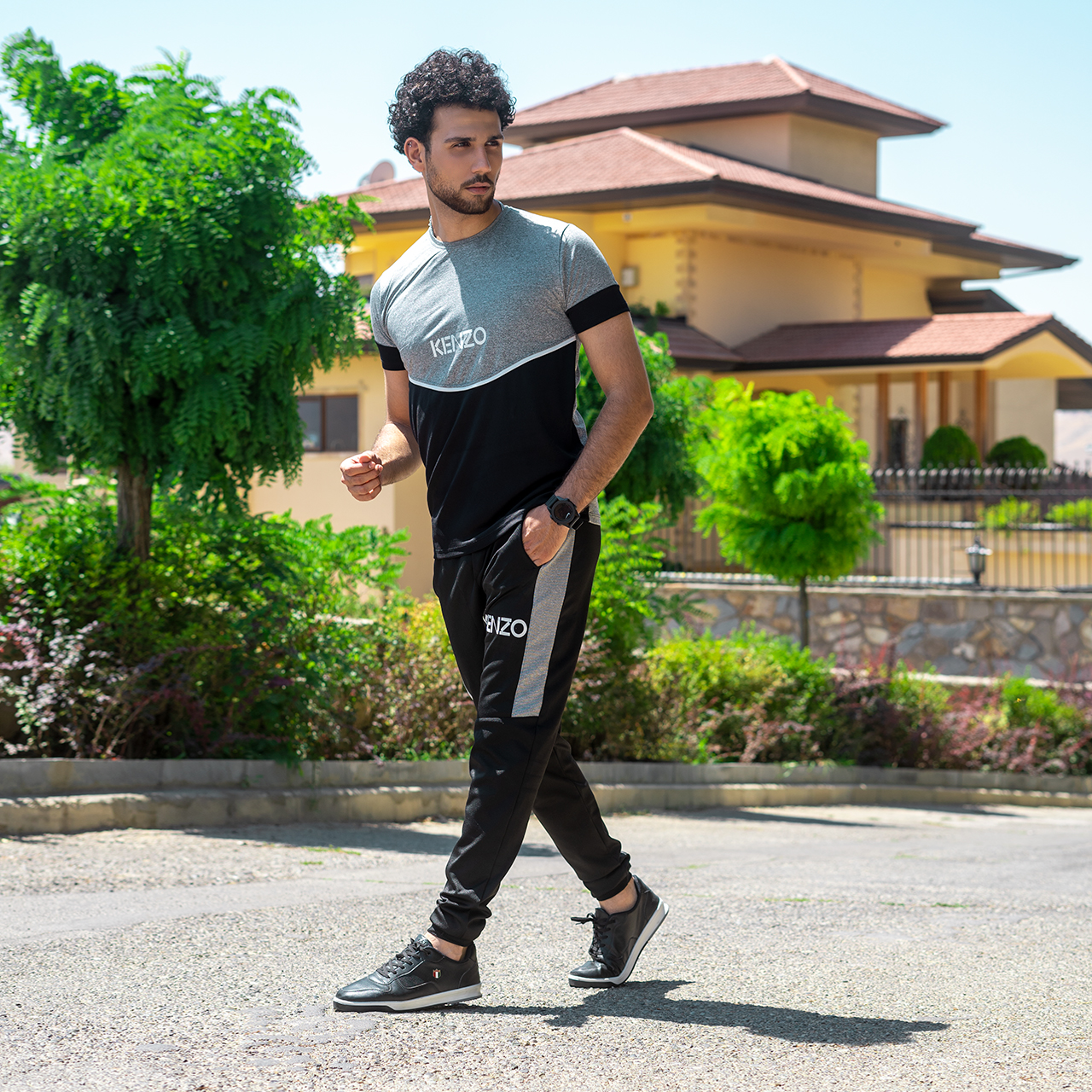 ست تیشرت شلوار مردانه طوسی مشکی مدل kenzo