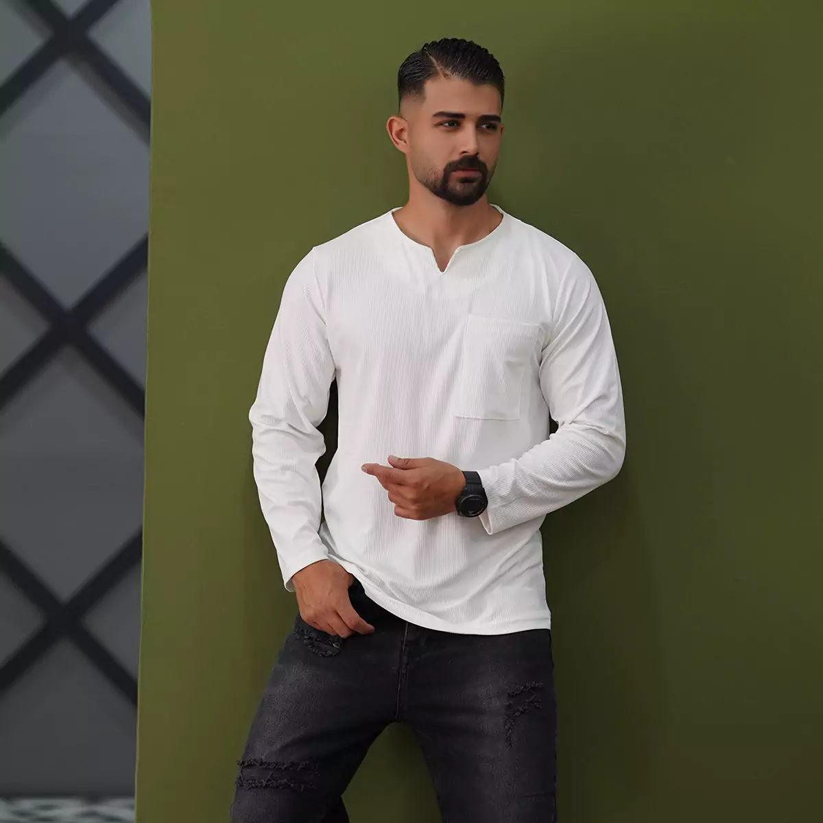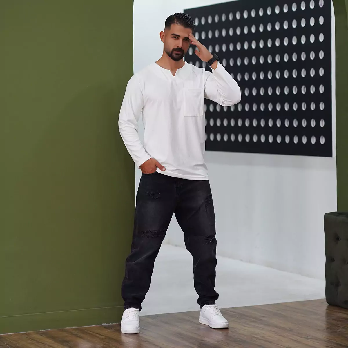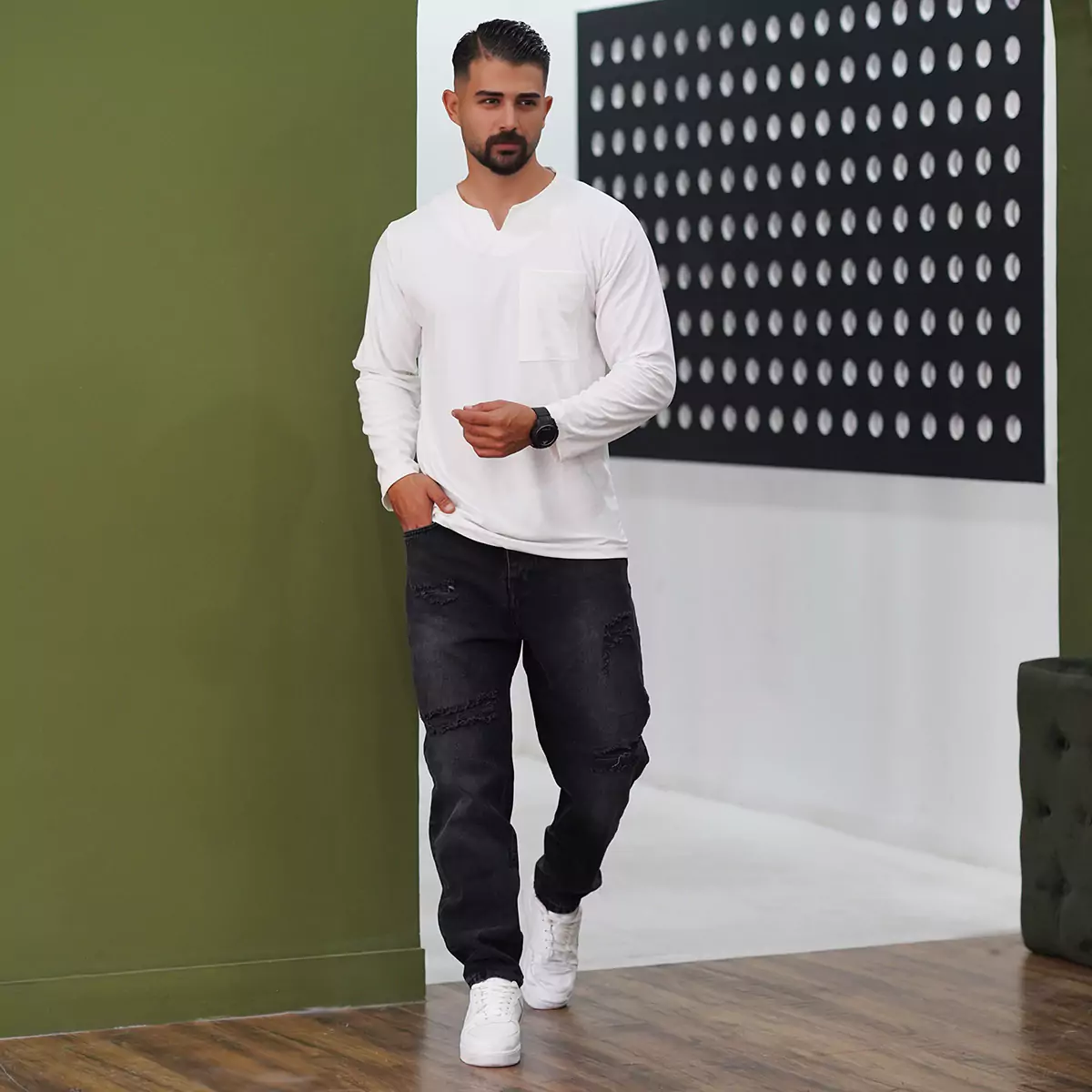 تیشرت آستین بلند یقه کوبایی سفیدمردانه مدل Asam
