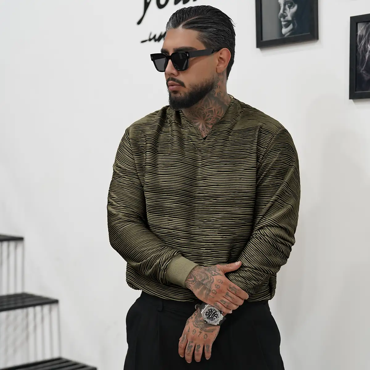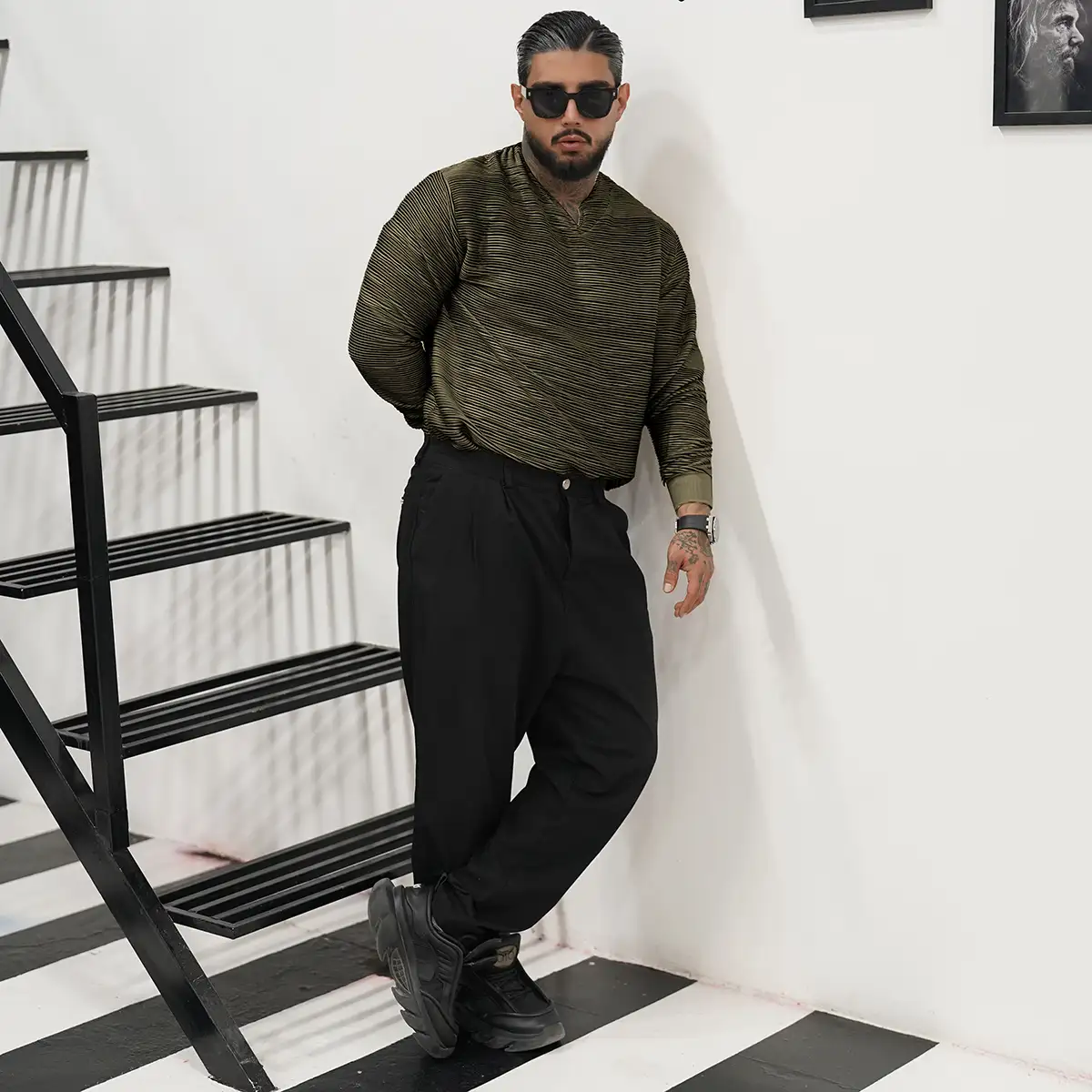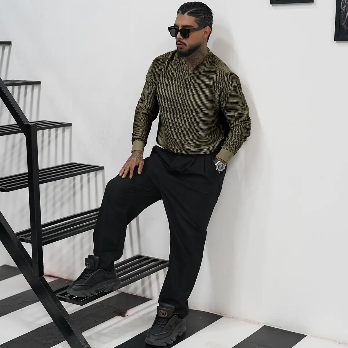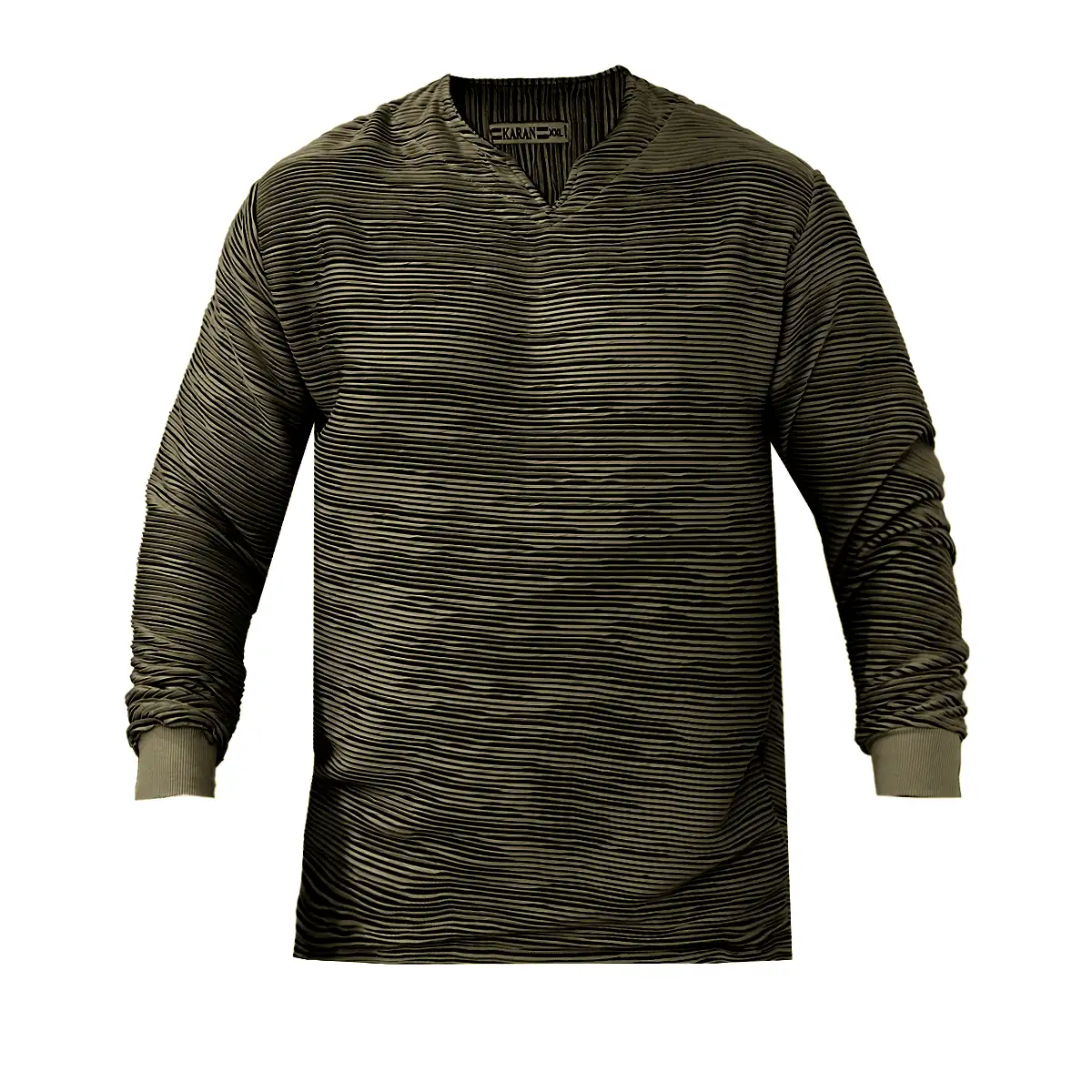 تیشرت آستین بلند یقه کوبایی سبز تیره مدل Nivad