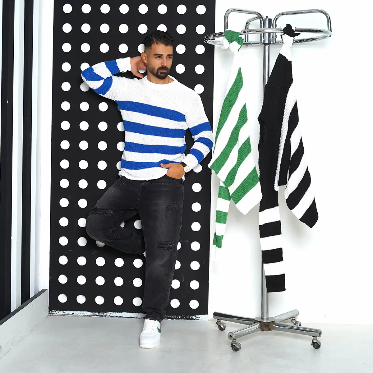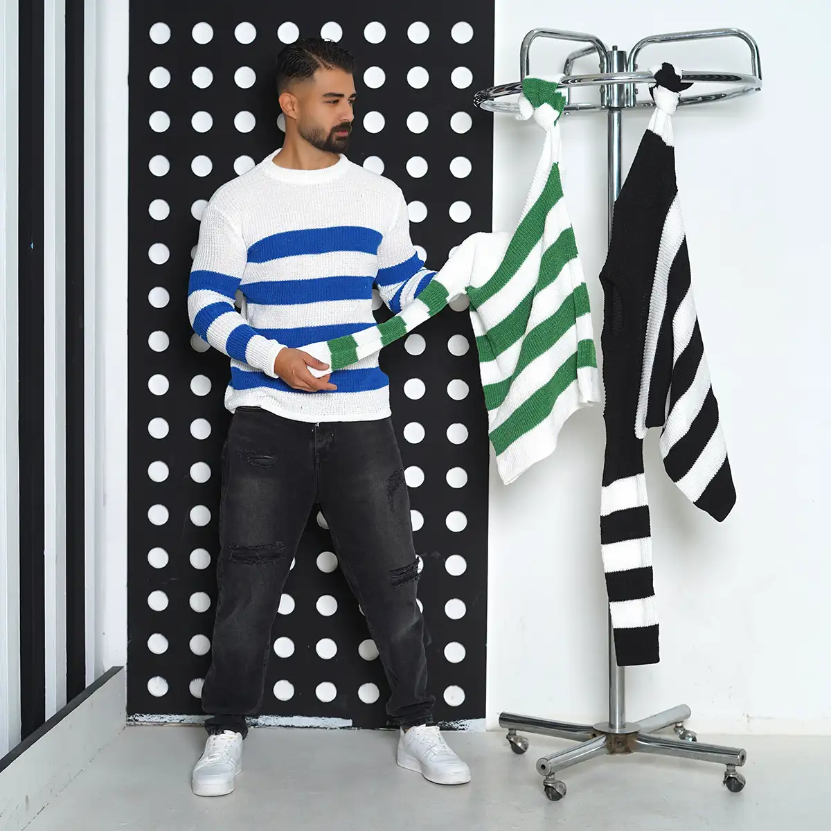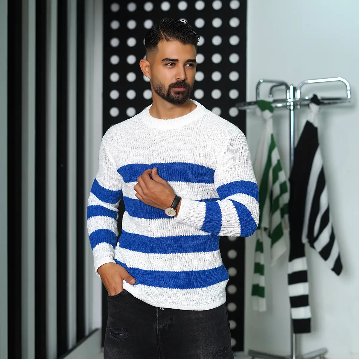 پلیور مردانه راه راه سفید آبی مدل Mahyad