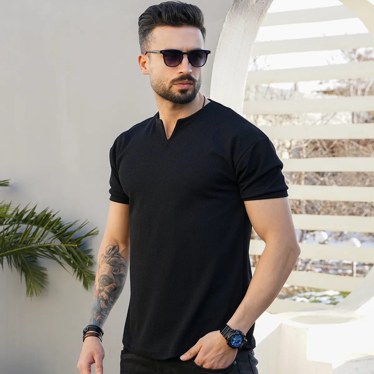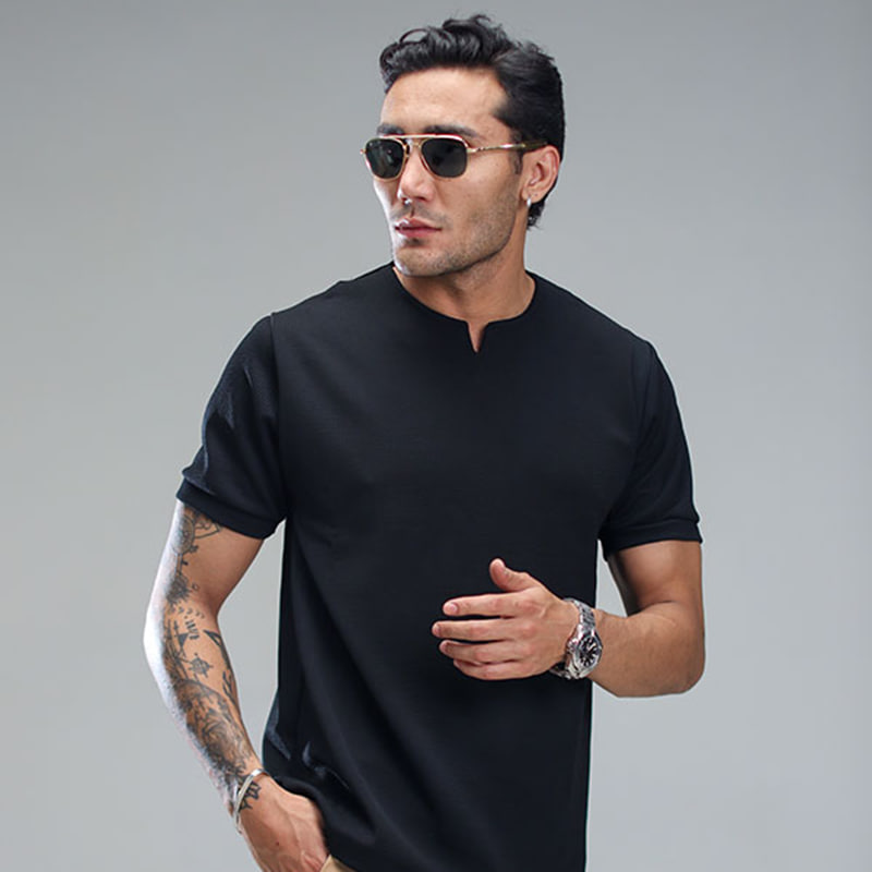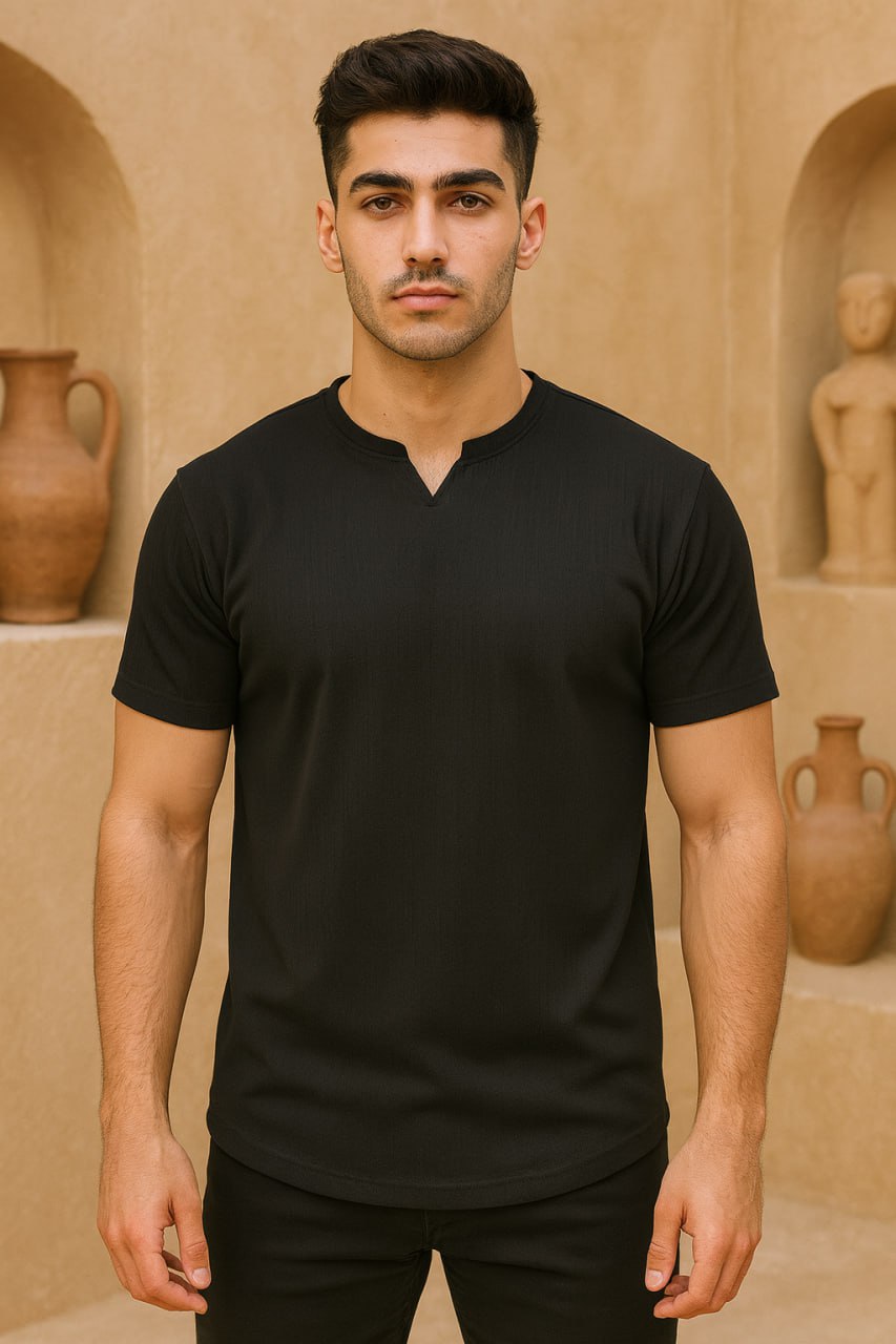 تیشرت آستین کوتاه یقه کوبایی مشکی مردانه مدل Asam