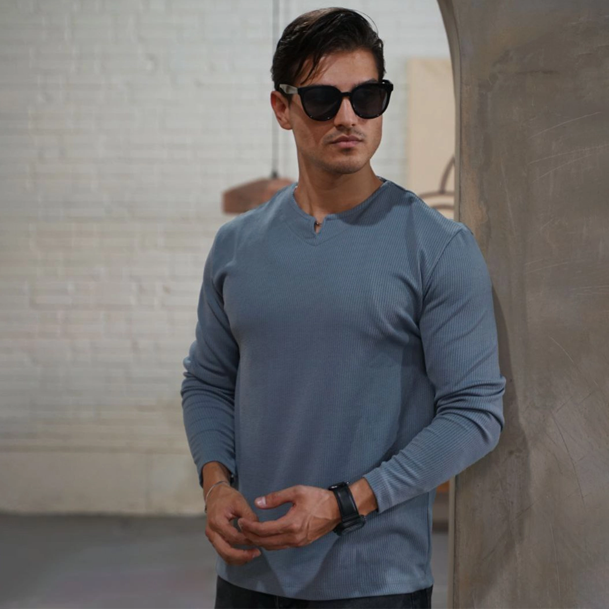 بلوز مردانه طوسی تیره یقه کوبایی مدل Etron