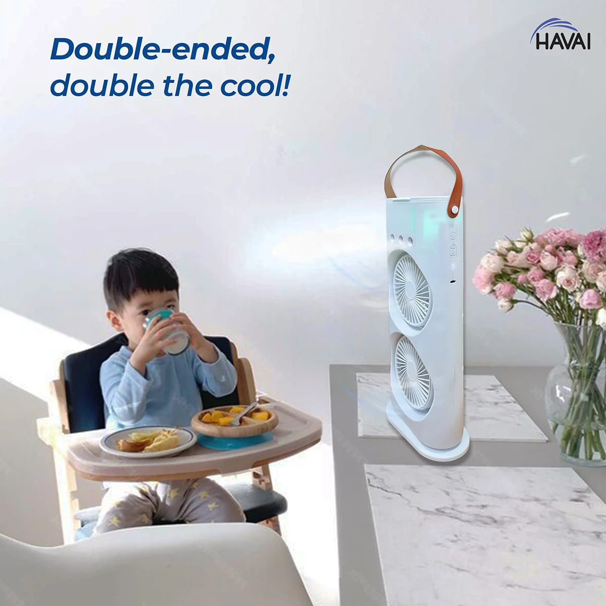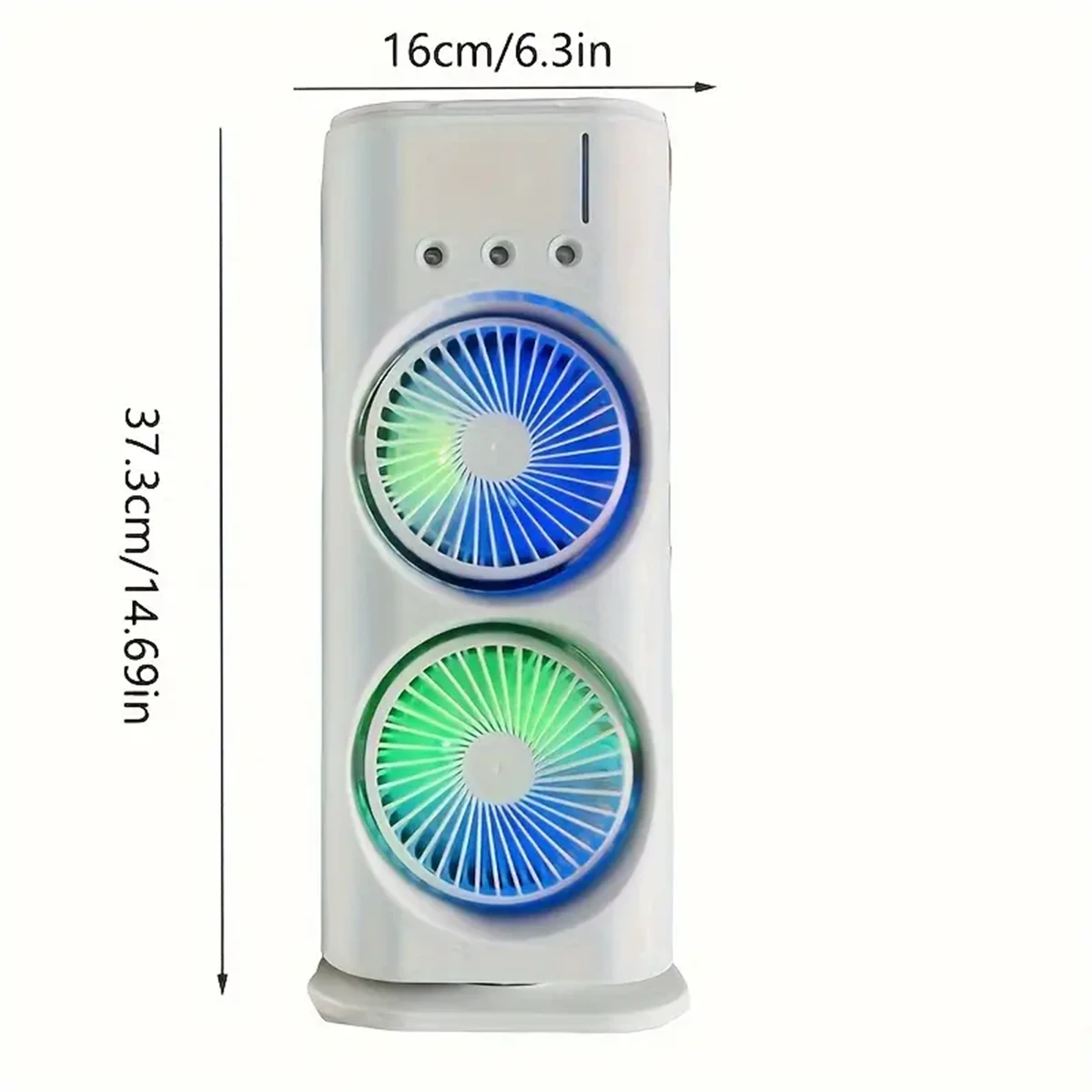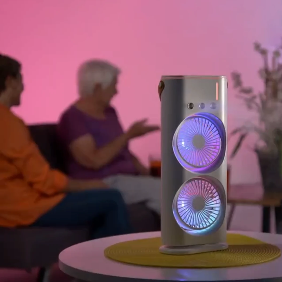 فن دو سر چند منظوره با قابلیت تنظیم سه سرعت باد و چراغ شب رنگی گرم، ایده‌آل برای استفاده در هر فضا. جهت باد قابل تنظیم و طراحی زیبا. هم‌اکنون خرید کنید و از خنکی لذت ببرید.