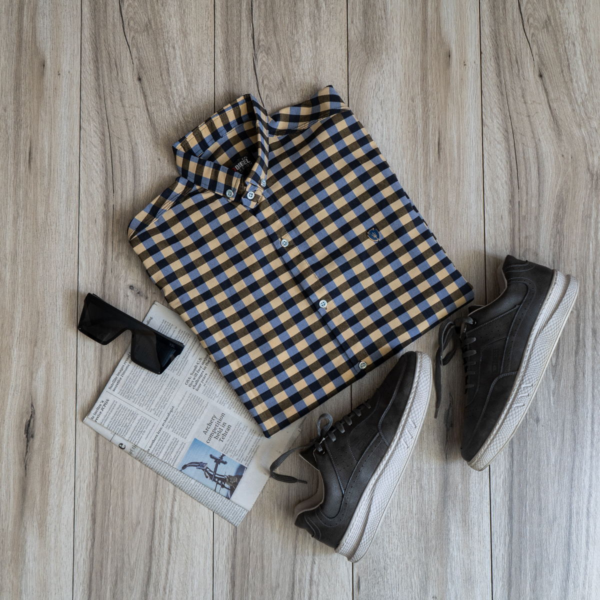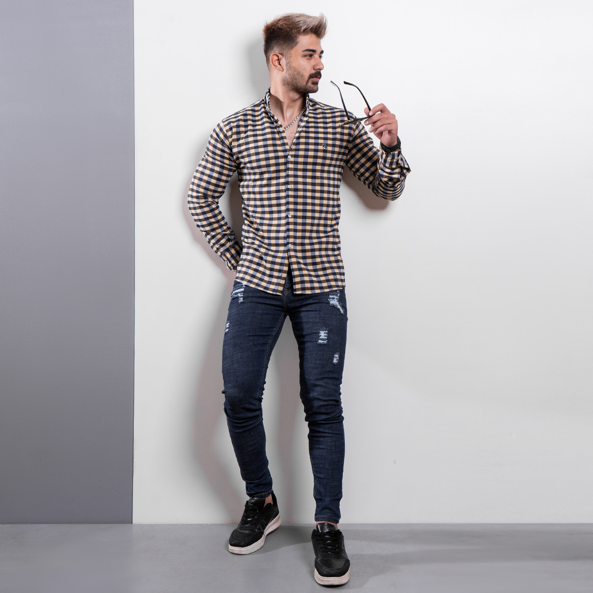 پیراهن شطرنجی زرد مردانه مدل Crown